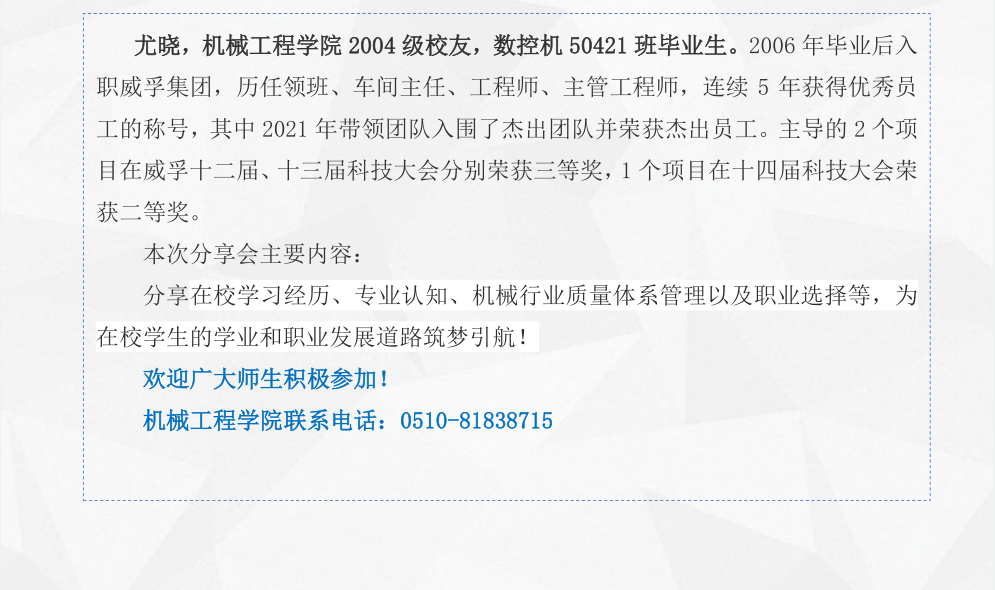 学校地址:江苏省无锡市大学城高浪西路1600号 邮编214121 校友办联系电话:0510-81838917 校友会邮箱:alumni@wxit.edu.cn