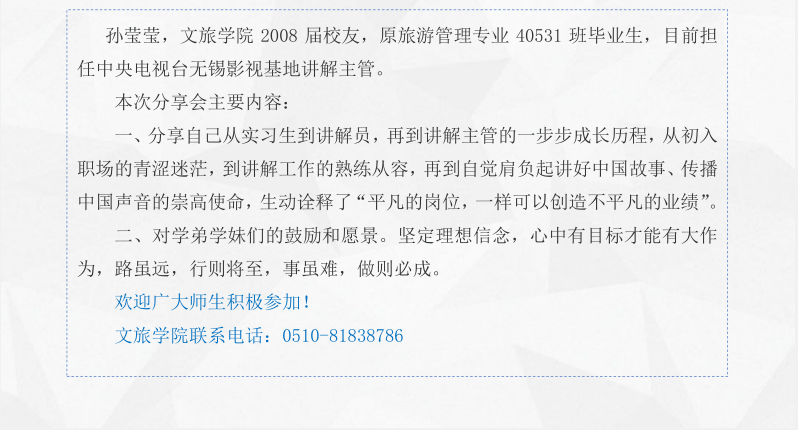学校地址:江苏省无锡市大学城高浪西路1600号 邮编214121 校友办联系电话:0510-81838917 校友会邮箱:alumni@wxit.edu.cn