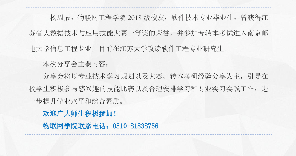 物联网工程学院举办“母校有约”校友活动:杨周辰——“榜样有光 照亮远方”我的逐梦故事